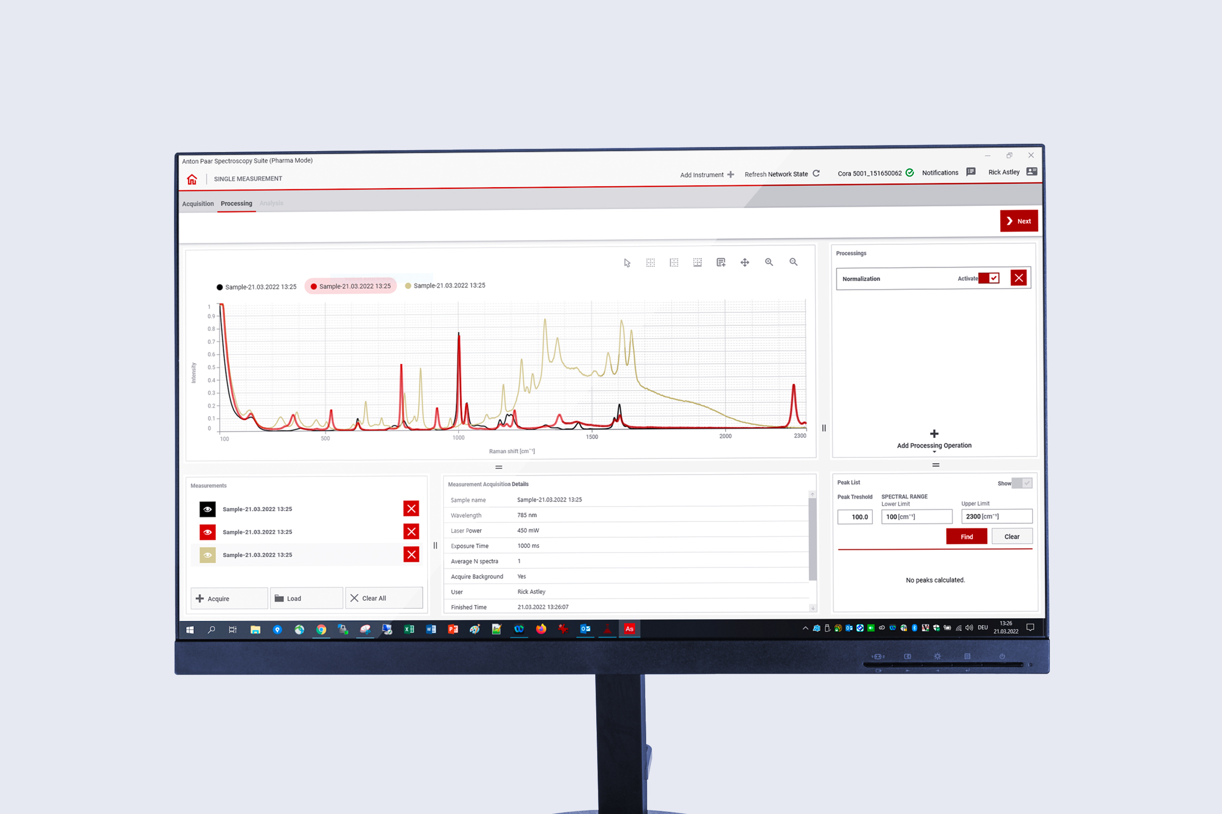 monowave 400 r 提供了高达 300°c 的温度和高达 30 bar 压力的全部操作参数。cora 5001 拉曼分析仪可在反应过程中直接在反应瓶内进行时间序列测量,时间间隔和曝光时间可调。微波反应器与拉曼光谱仪通过特殊的光纤拉曼探针连接。