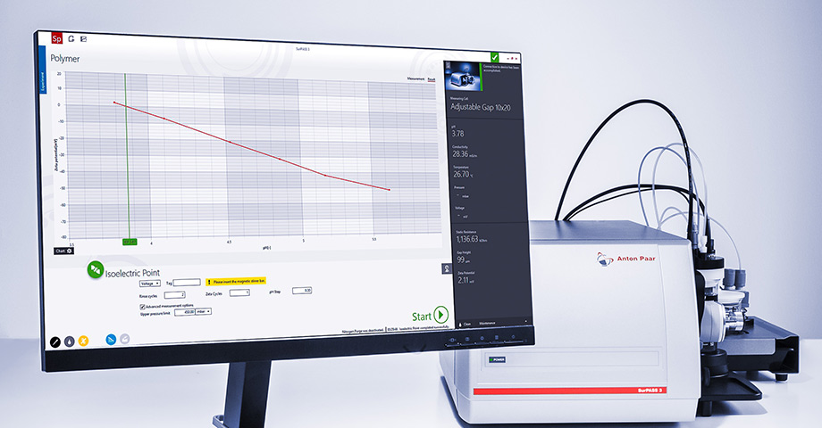 surpass 3 系列直接分析固体/液体界面处的 zeta 电位,通过测量流动电势和流动电流得出。在保证前所未有的可靠性和再现性条件下,样品 zeta 电位可以低至几毫伏。无需复杂的评估或专门知识,即可立即获取表面电荷信息。