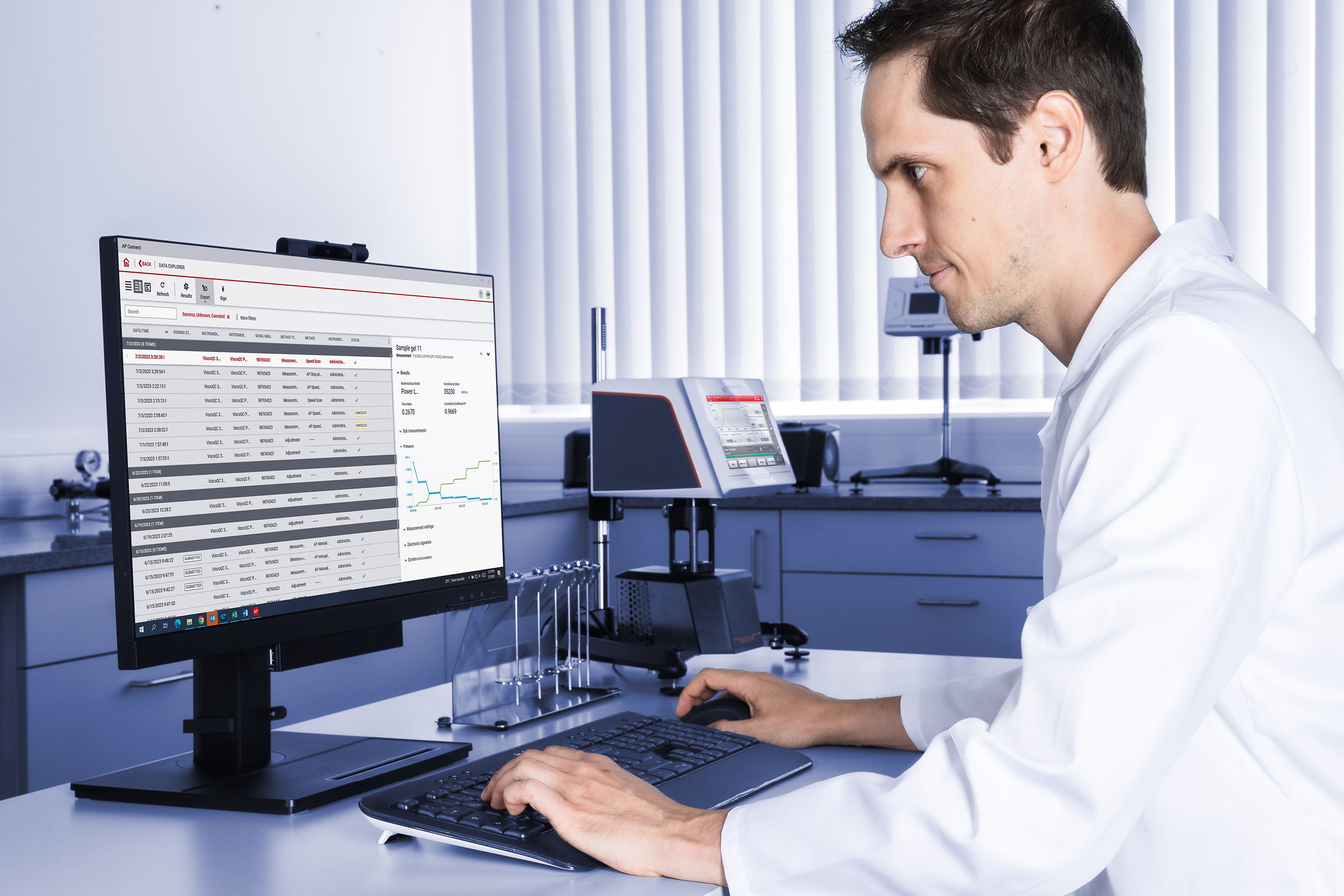 每个 viscoqc 都包括 v-collect pc 数据采集软件。由于 viscoqc 100 不存储任何数据,因此每次测试后,结果将直接导出或通过 brother ql-700 标签打印机打印。viscoqc 300 拥有可存储多达 999 次测量及多达 10,000 次子测量的150 mb 存储空间。此外,还可以将数据以 pdf、csv、页面打印机(usb 或网络)或标签打印机打印或导出。对于自动数据导出,viscoqc 300 可通过实验室信息管理系统 (lims) 或 ftp 服务器集成到您的网络中。借助 ap connect 开启您的无纸化实验室,连接您的仪器、传输测量信息并能确保合规性。
